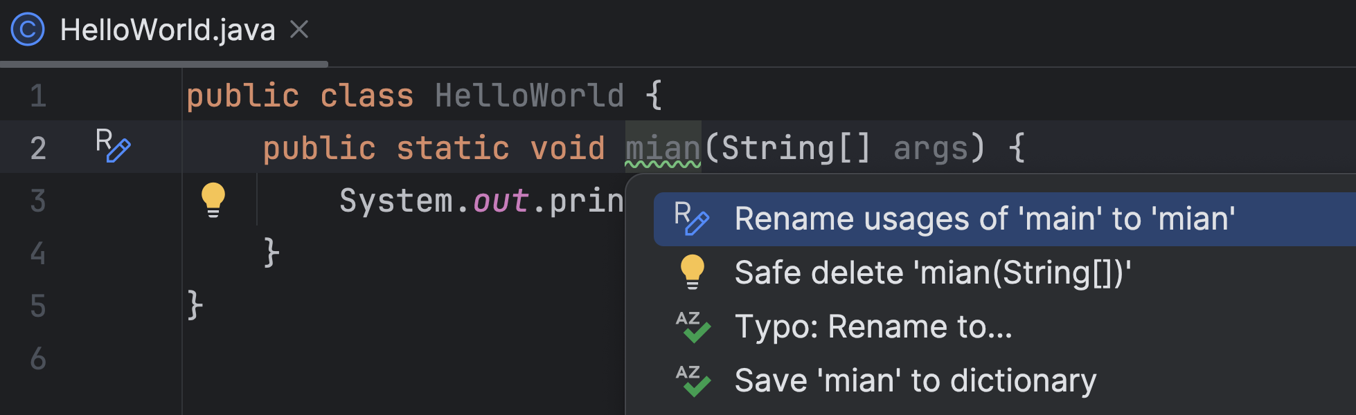 - We can rename classes, variables and methods using Refactor | Rename (⇧F6 on macOS, or Shift+F6 on Windows/Linux).