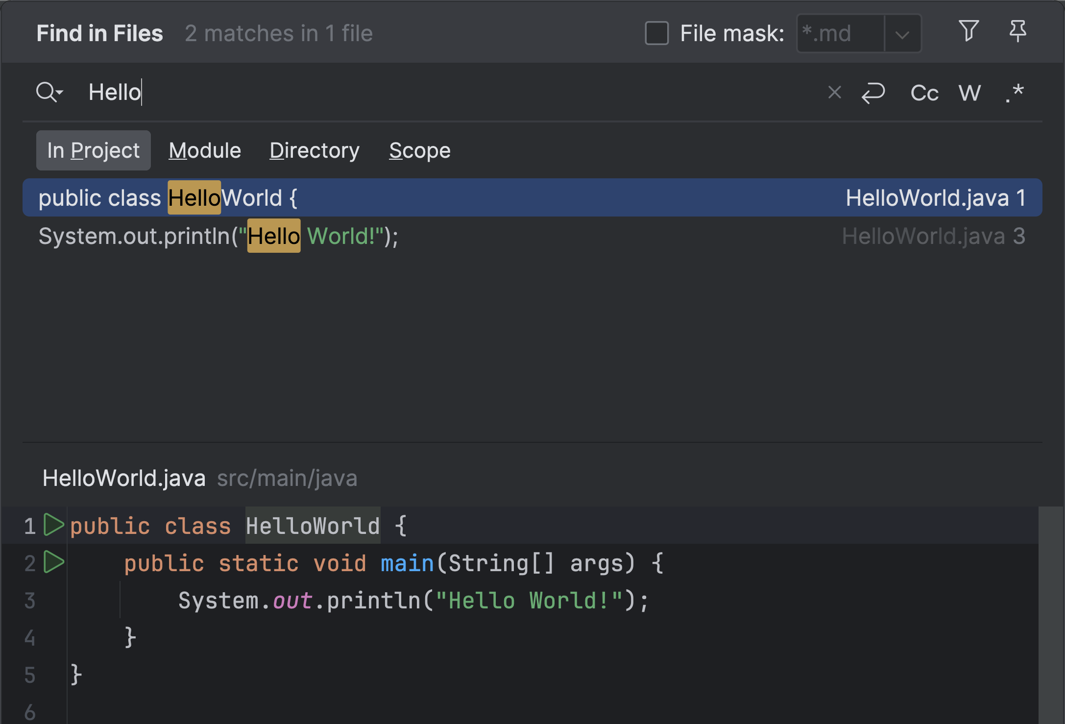 Another popular way to search is Find in Files. Open Find in Files from the main menu using Edit | Find | Find in Files, or by using the shortcut ⌘⇧F (on macOS) or Ctrl+Shift+F (on Windows/Linux). You can narrow down the results from In Project to Module, Directory, or Scope.