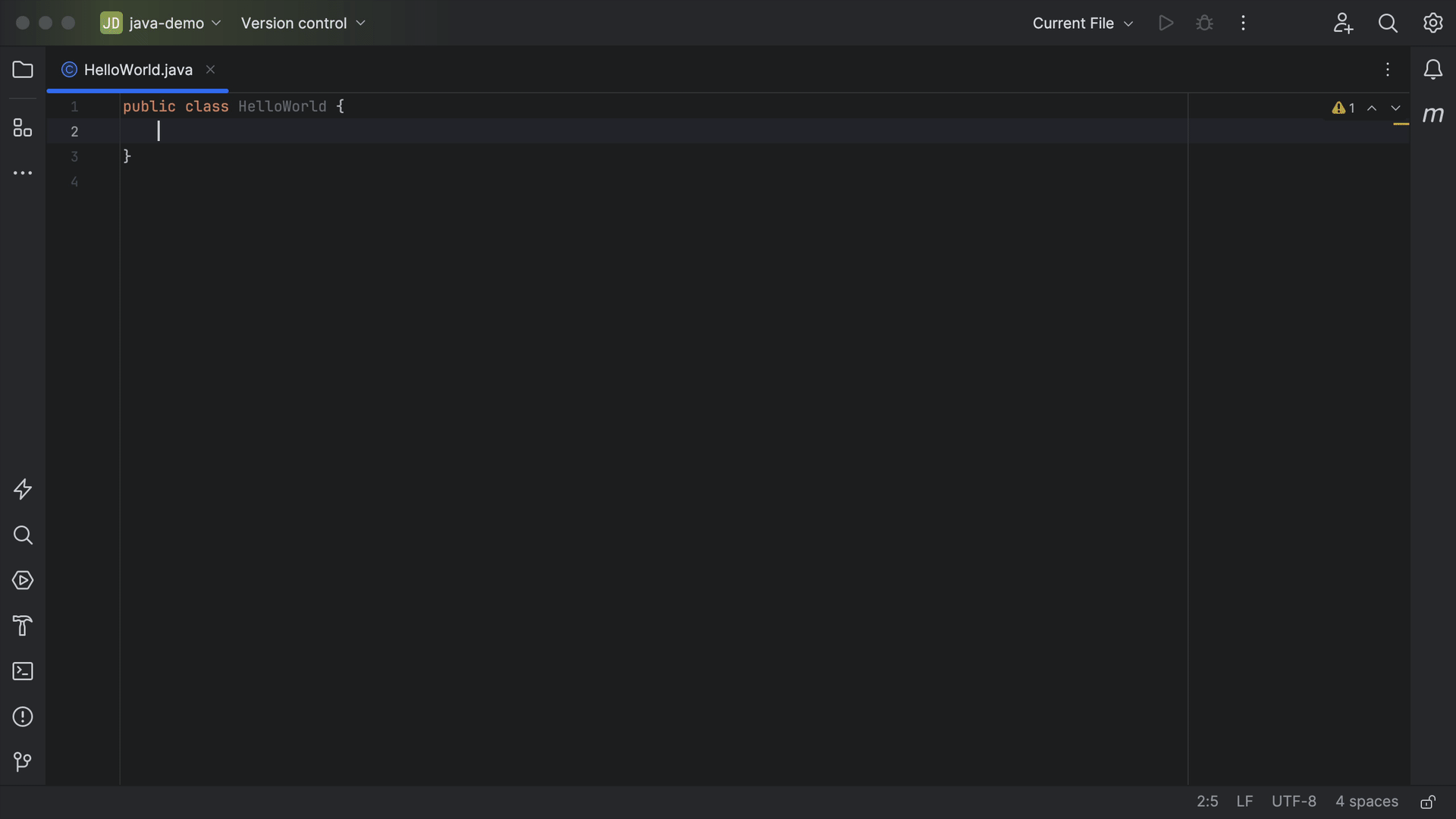 You can run the HelloWorld application directly from the editor, by clicking the green Run button in the gutter near the class declaration, or using the shortcut ⌃⇧R (on macOS) or Ctrl+Shift+F10 (on Windows/Linux).