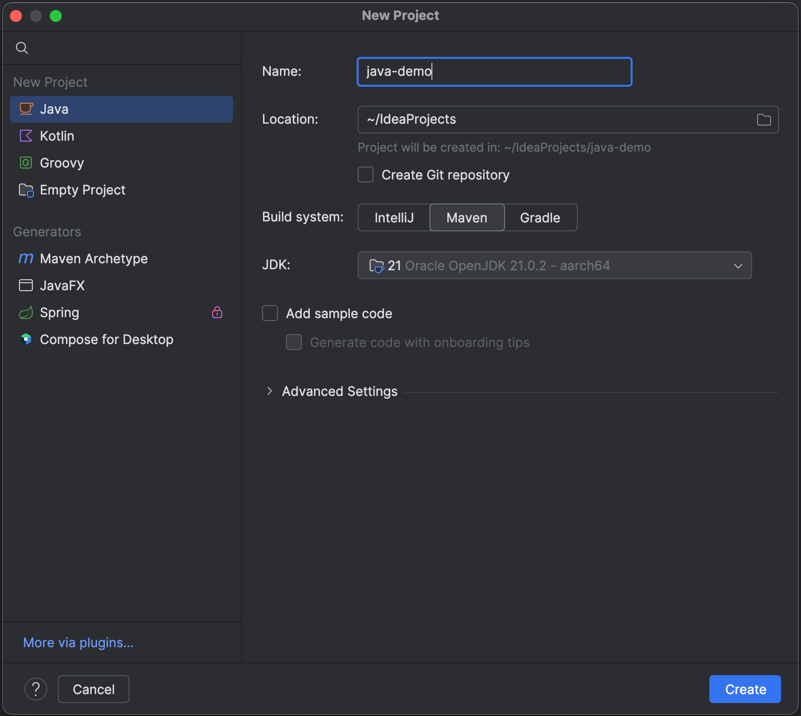 If you select Add sample code, a Main class which prints out “Hello World” will be added to your project. Leave it unchecked, so we can add our own later.